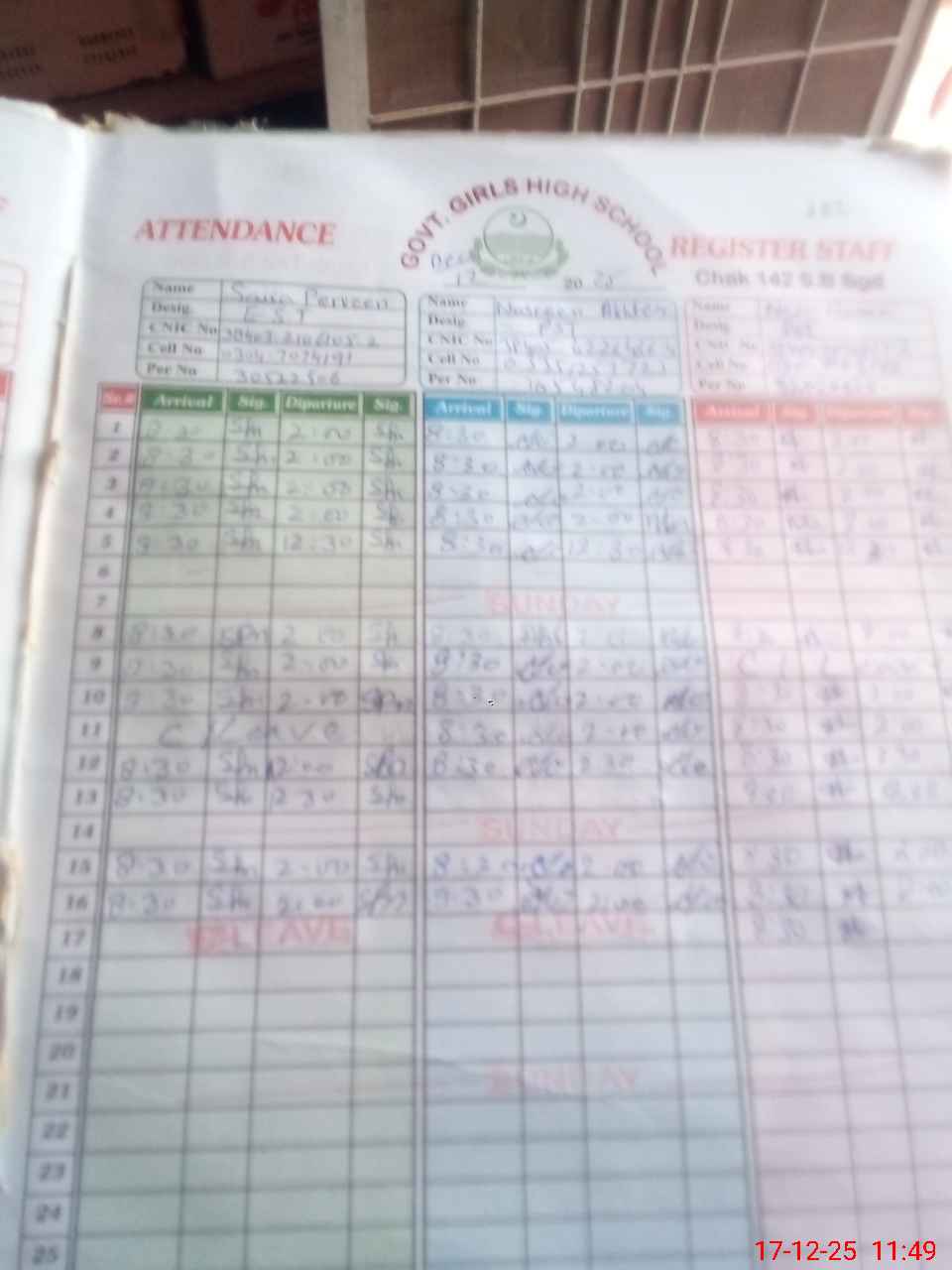 | CNIC | Full Name | Designation | R/C | Absence During Last Calender Month |