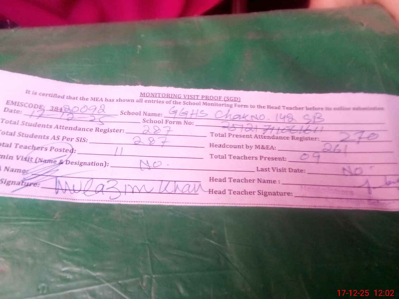 | Attendance Register | Head Teacher | MEA with School | Visit Proof |