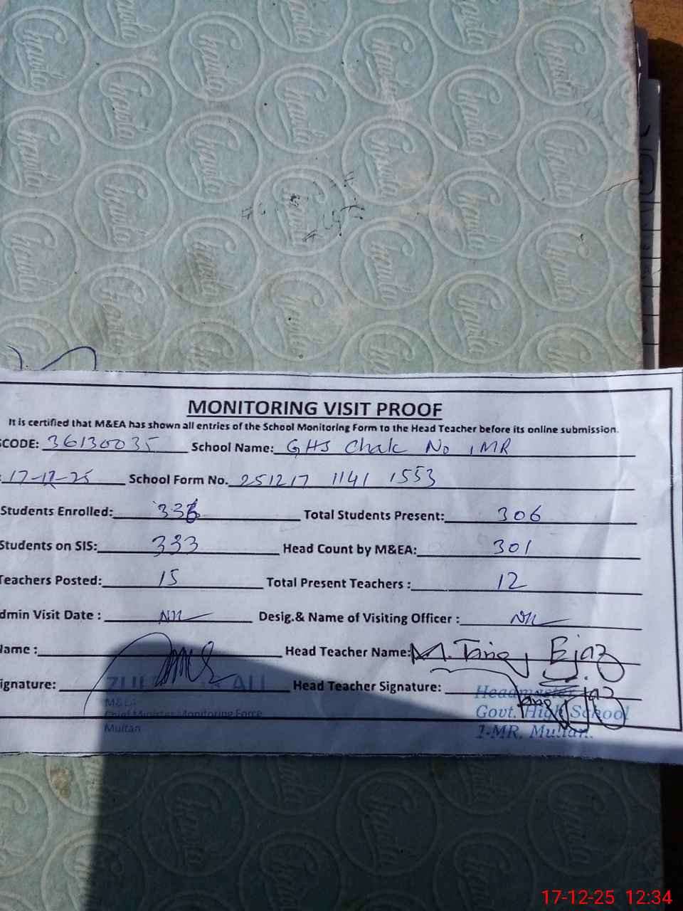 | EMIS Code: 36130035 | Name of School: GHS CHAK NO. 1/MR P/O KHAS MULTAN | |||