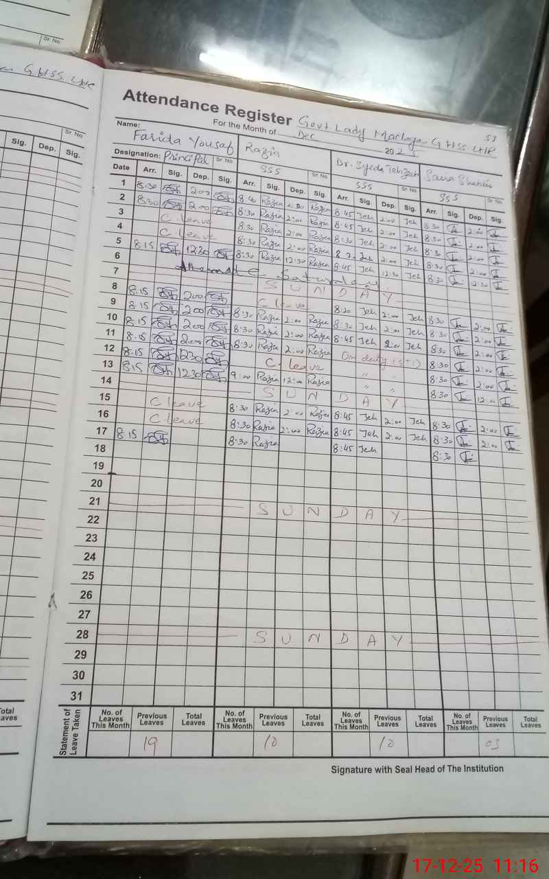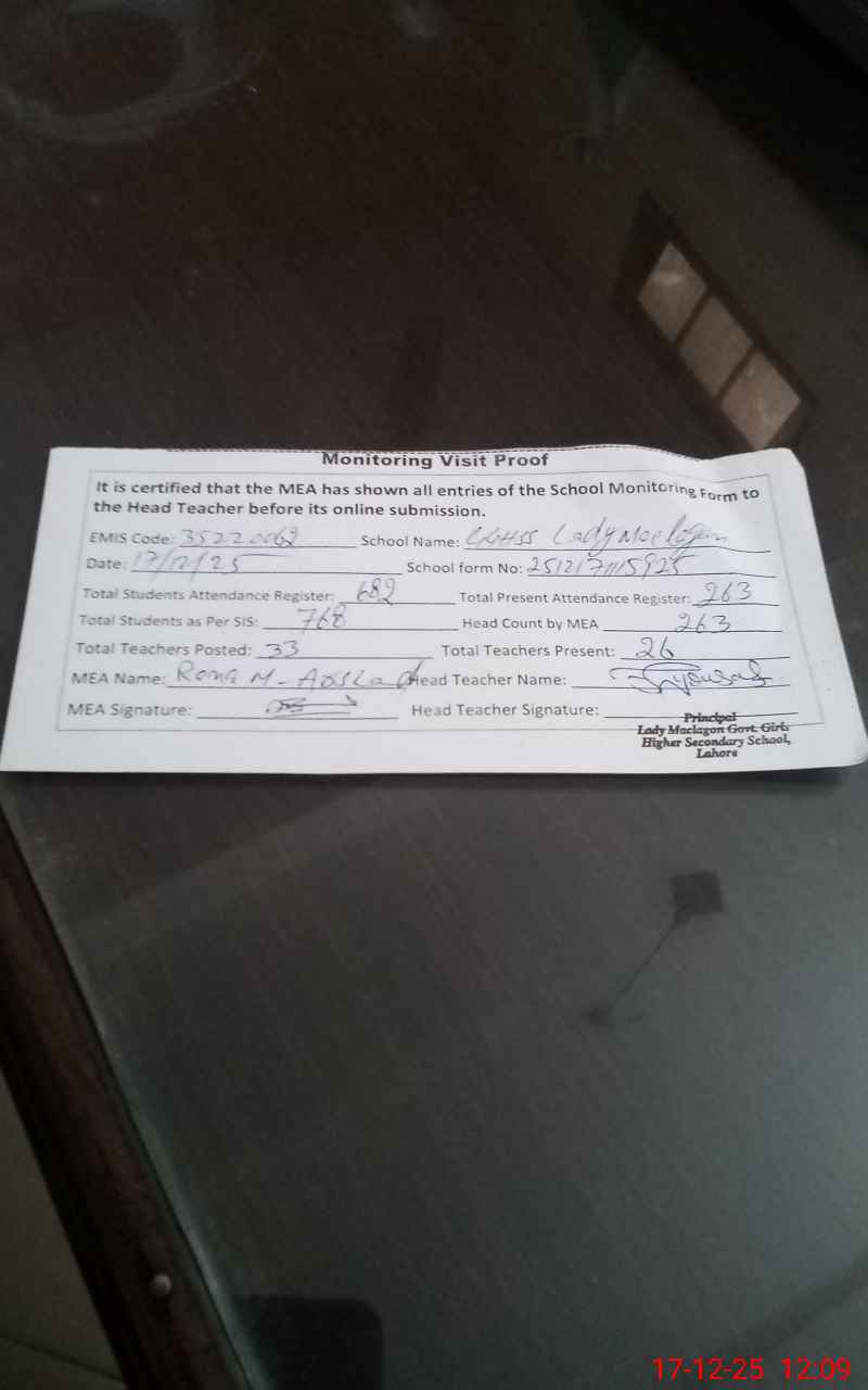 | Remarks (Use Separate Page if Required): Teacher Ayesha Majeed SSE on Maternity leave wef 24.11.25 but her Sanctioned maternity leave was not available on line or manual so according to monitoring sop mark her Absent. Teacher Shehrash PTC and Teacher Asma Sadia PTC both REGN from duty but still their name not removed from SIS. Teacher Saima Noreen EST Absent from duty 4.12.25 to date. JC Rehan present as per attendance register but he was not physically present in school so according to monitoring sop mark him Absent today | |||||