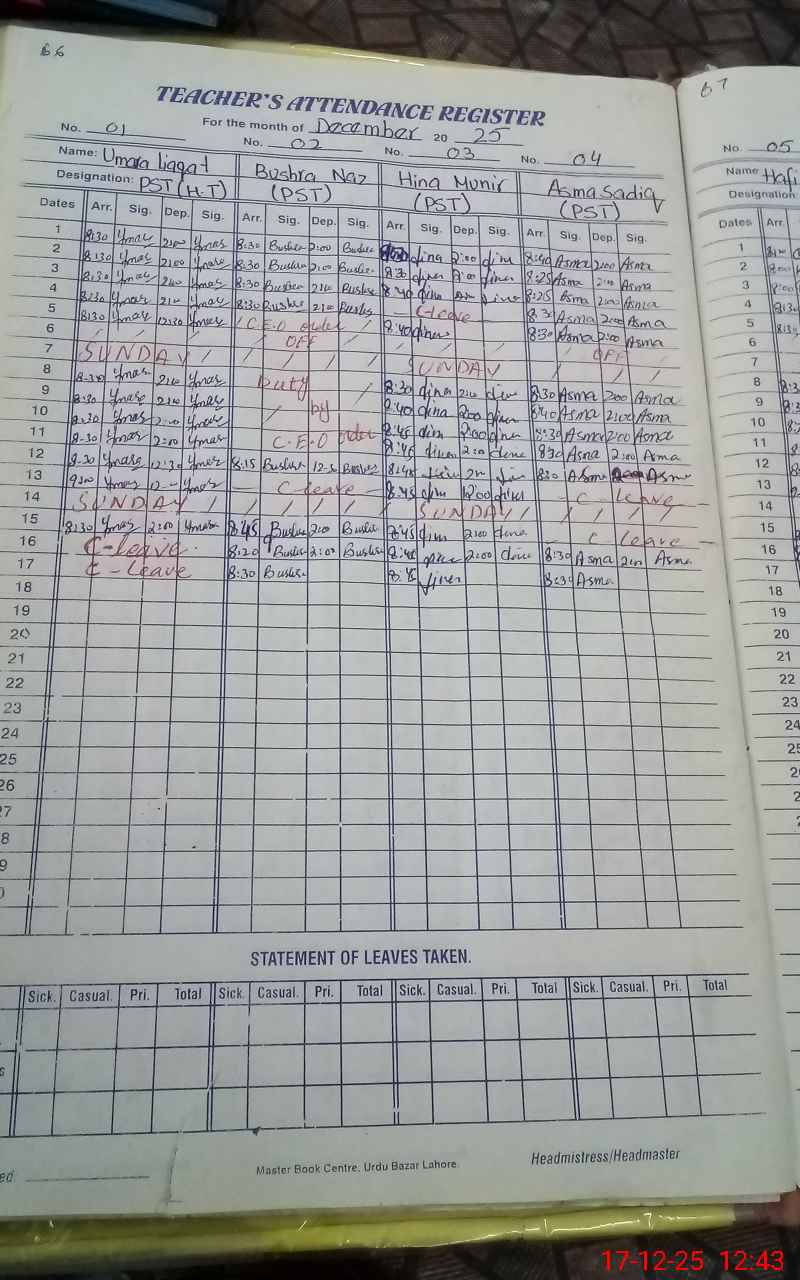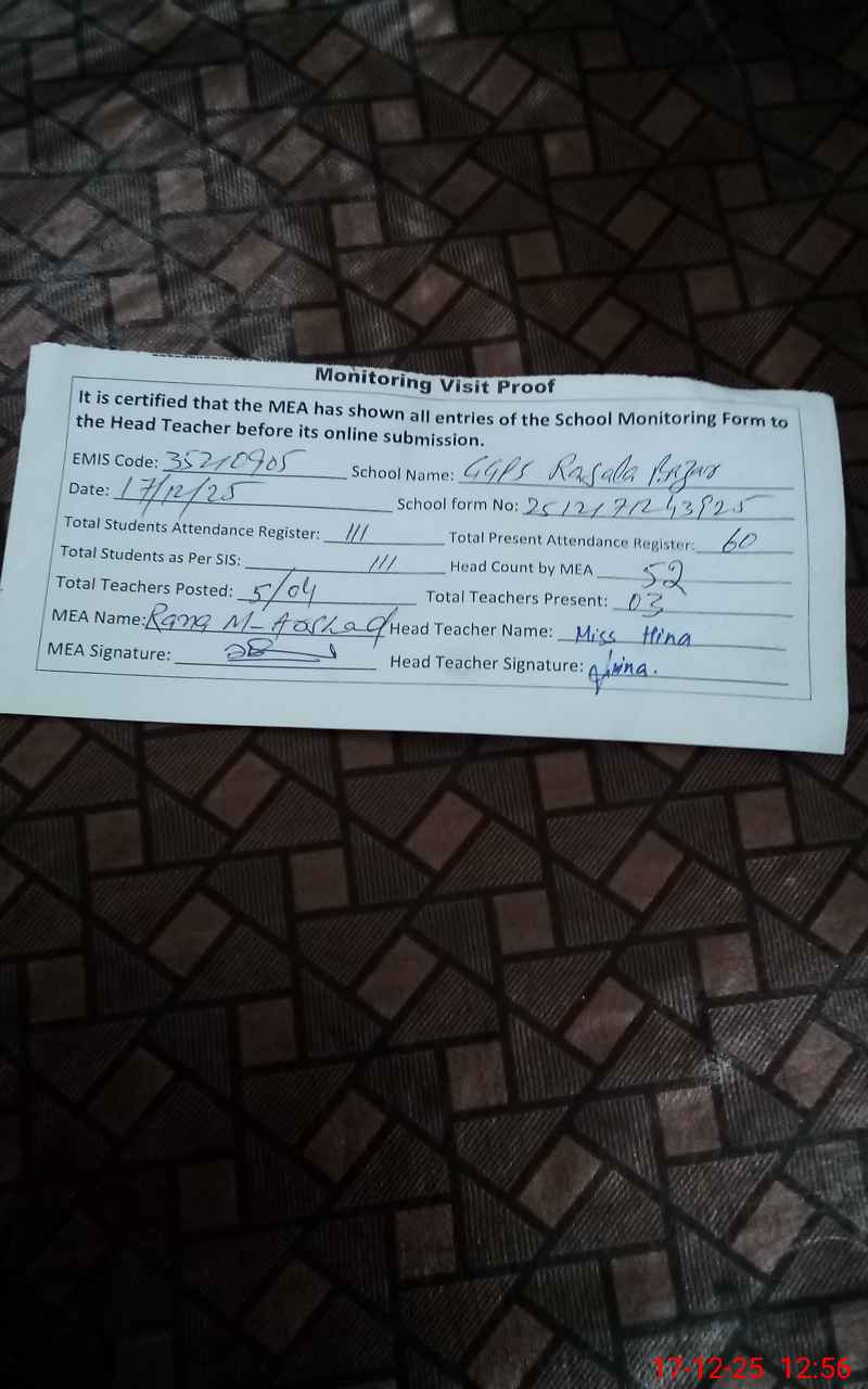 | Remarks (Use Separate Page if Required): Head teacher Ammara Liaqat PST on casual leave for 02 days but her Sanctioned casual leave was not Shown to MEA , on line or manual so according to monitoring sop mark her Absent. Sweeper Sunny on Casual leave as per attendance register but his sanctioned casual leave was not available in school so according to monitoring sop mark him Absent today. NSB record not calculation properly. | |||||
