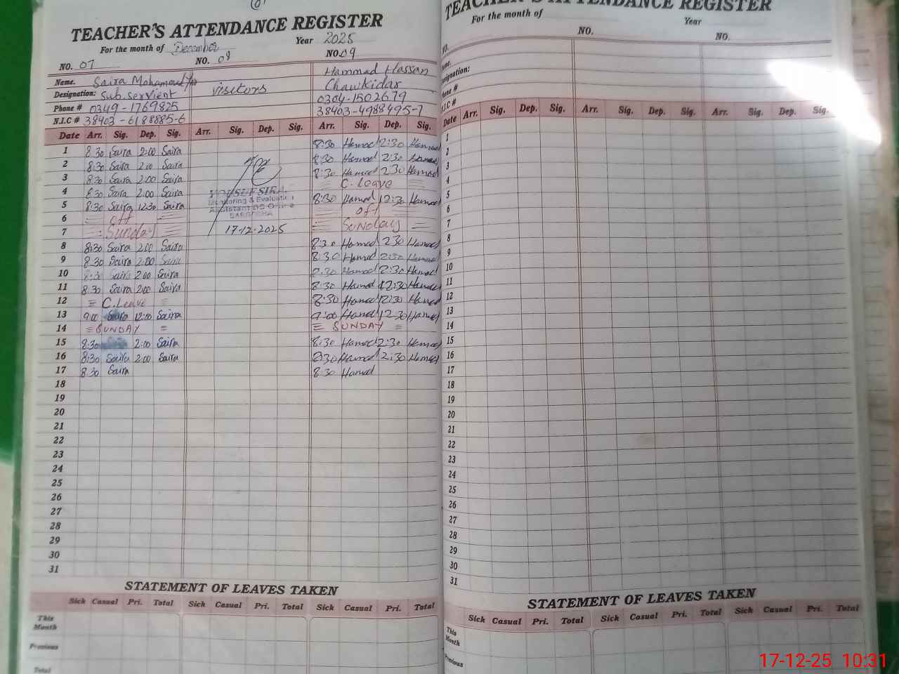 | CNIC | Full Name | Designation | R/C | Absence During Last Calender Month |
