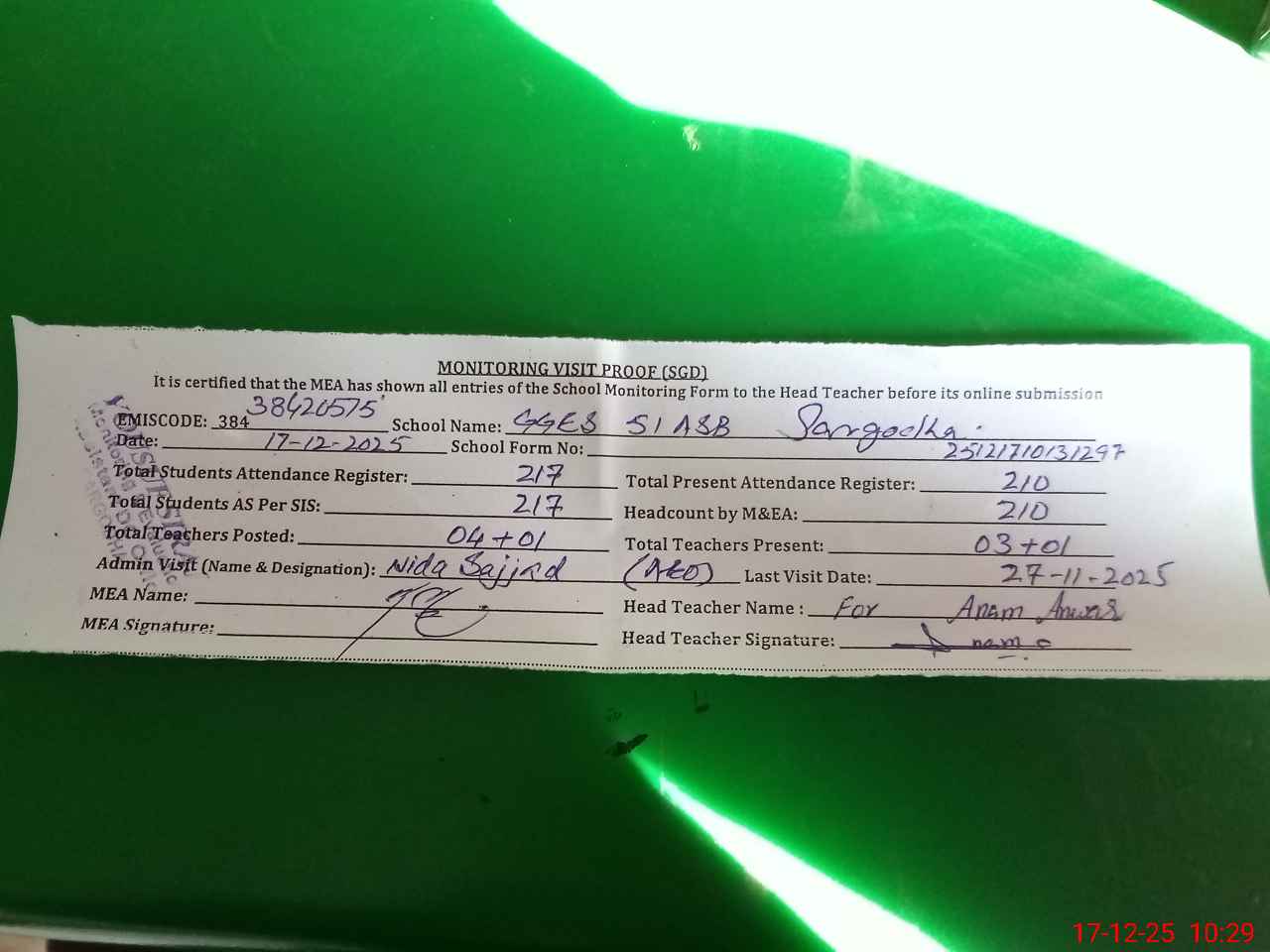| Attendance Register | Head Teacher | MEA with School | Visit Proof |