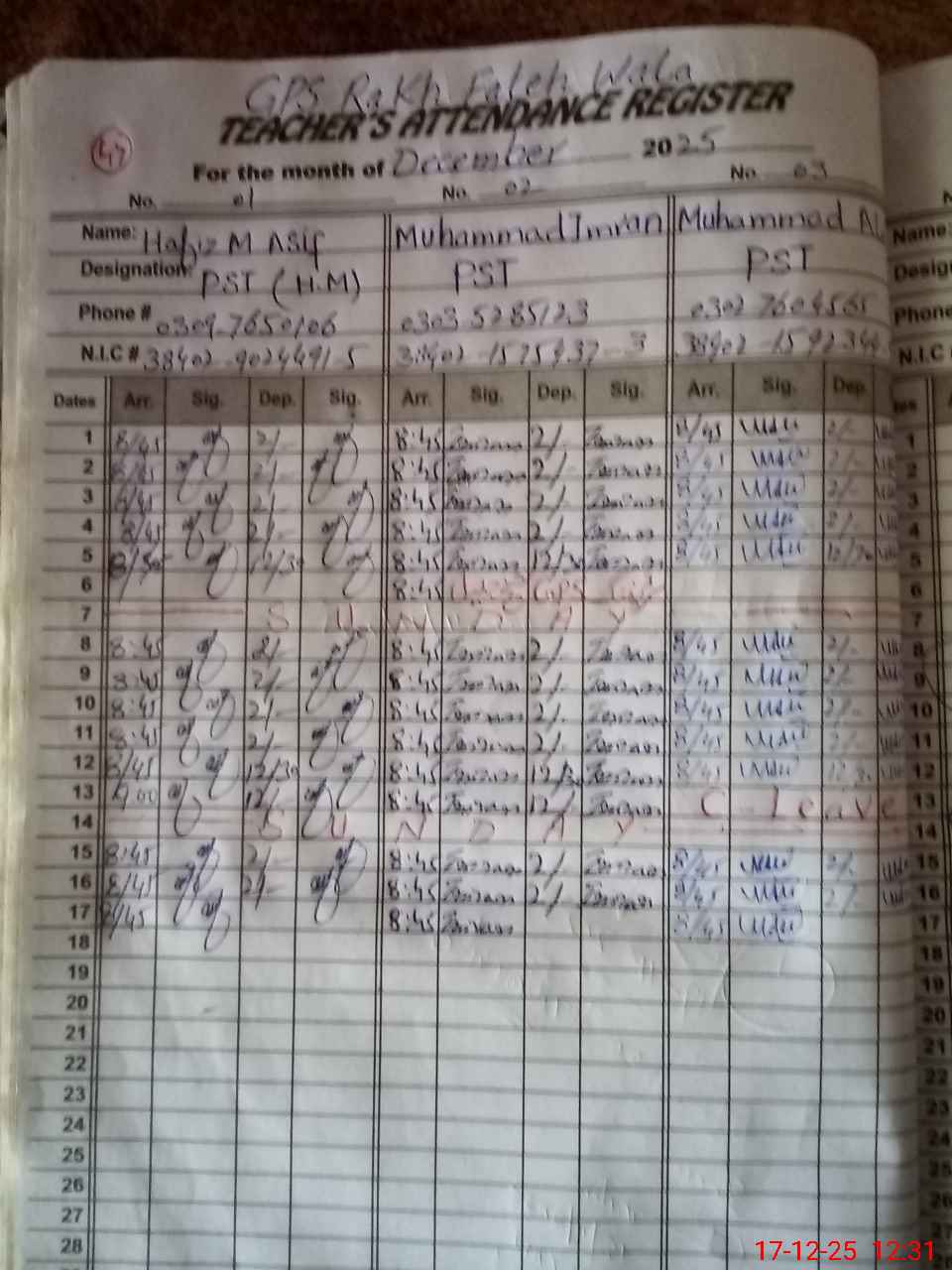 | CNIC | Full Name | Designation | R/C | Absence during last cal. month |