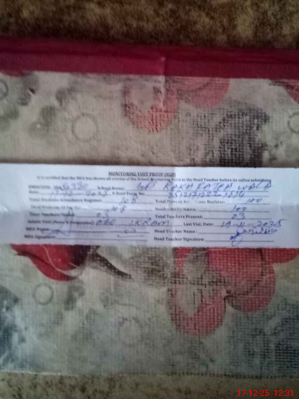 | Attendance Register | Head Teacher | MEA with School | Visit Proof |