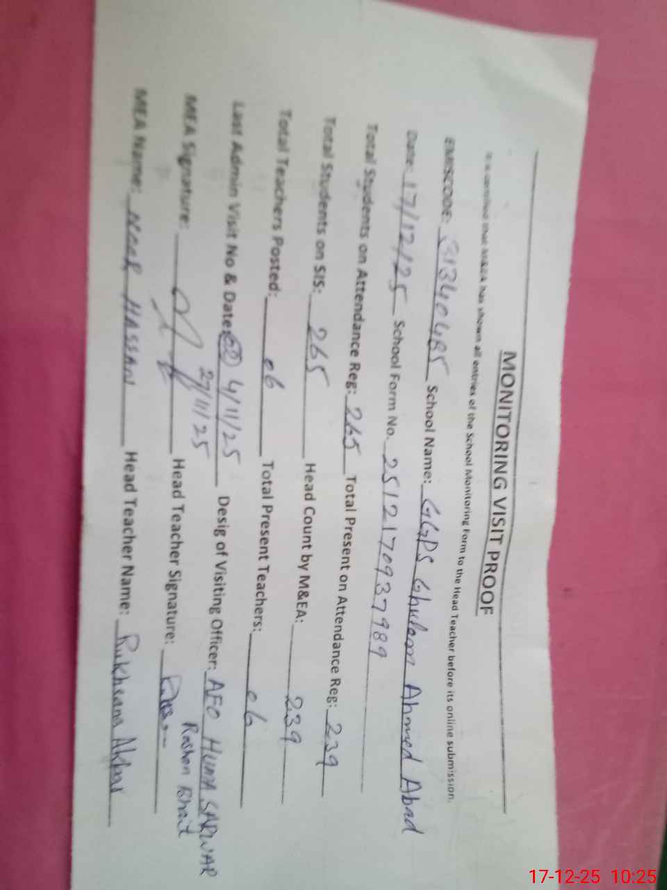 | Certified that this School was Inspected by the Undersigned MEA/DMO Today and the Information Stated Above is as Per Record. | |||||