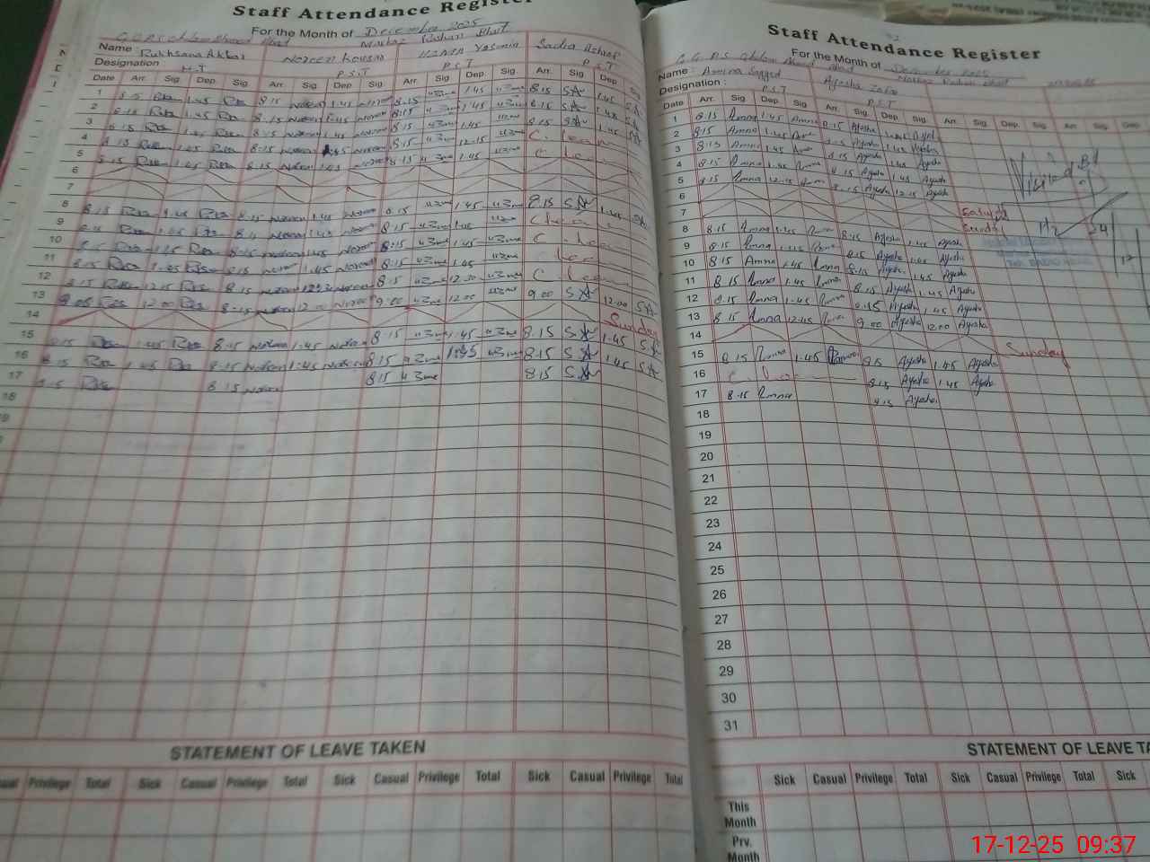 | CNIC | Full Name | Designation | R/C | Absence During Last Calender Month |