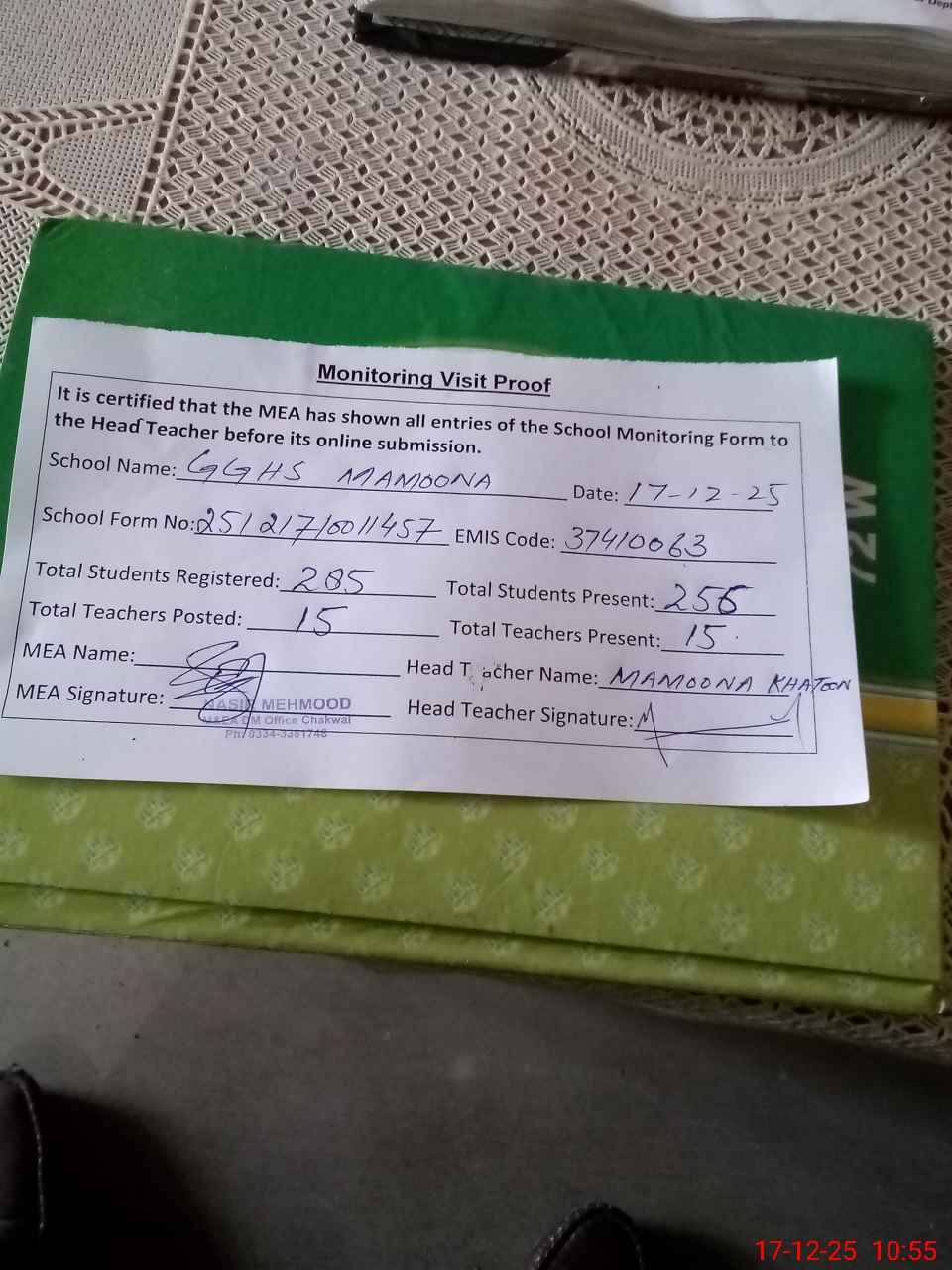 | EMIS Code: 37410063 | Name of School: GGHS SADWAL CHAKWAL | |||