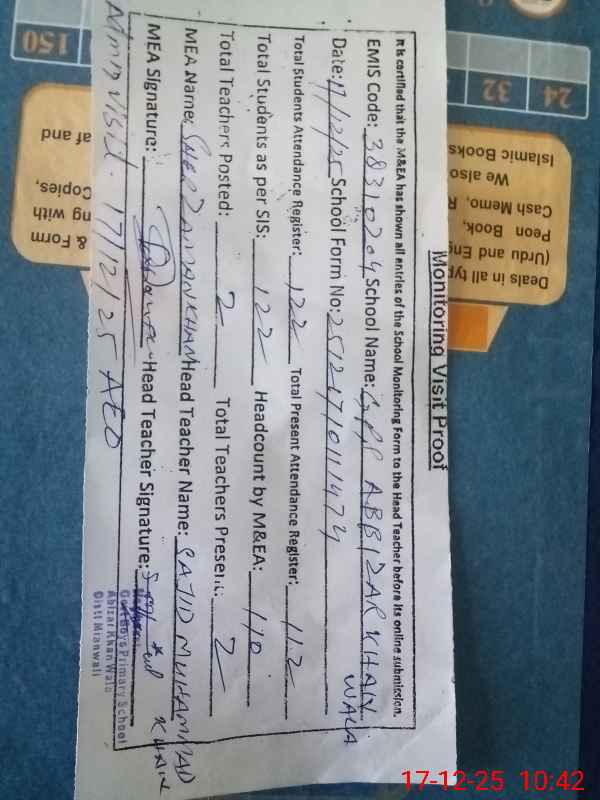 | EMIS Code: 38310204 | Name of School: GPS ABBIZAR KHAN WALA | |||