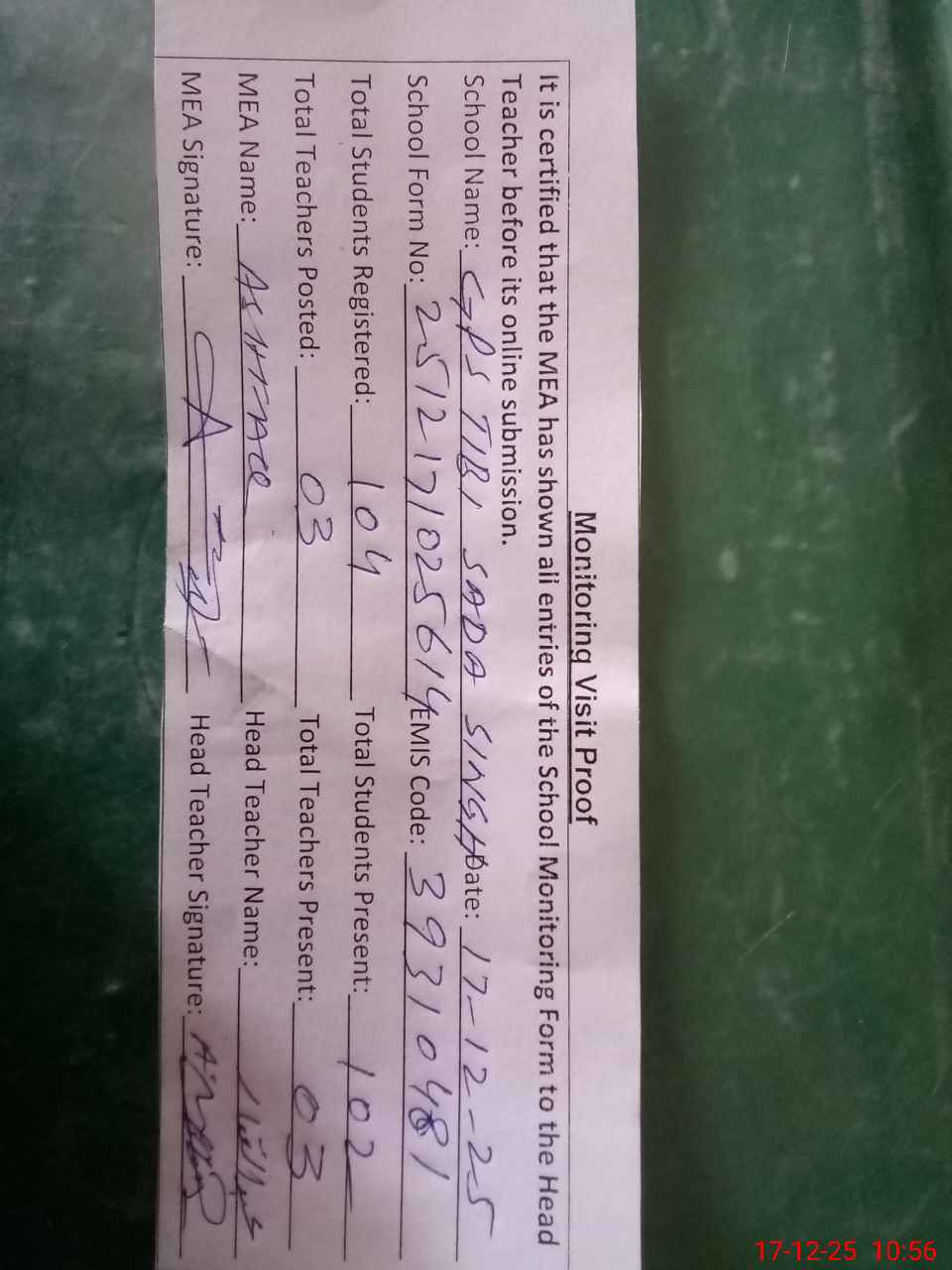 | EMIS Code: 39310481 | Name of School: GPS TIBBI SADA SINGH | |||