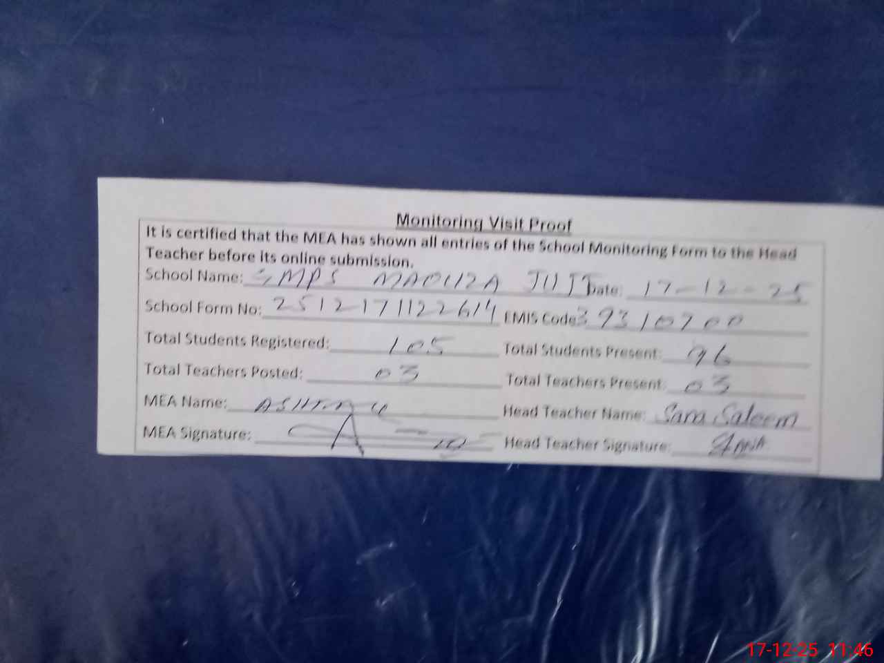 | Attendance Register | Head Teacher | MEA with School | Visit Proof |