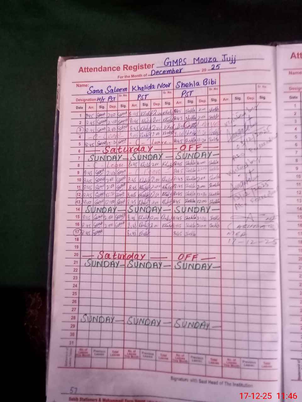 | CNIC | Full Name | Designation | R/C | Absence During Last Calender Month |