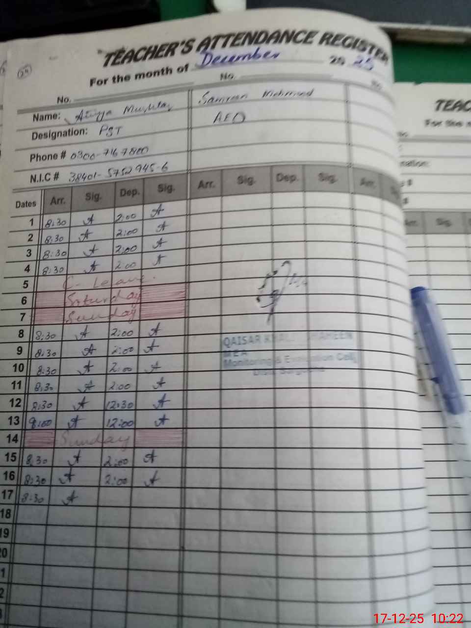 | Name: At**** Mu**** Designation: (School Headmaster's/Headmistress's) PST Phone/Cell Number: 03**** |