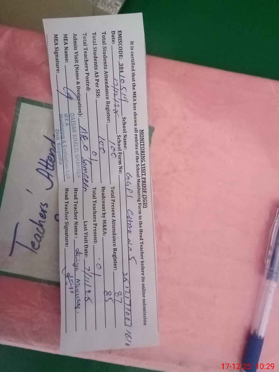 | Attendance Register | Head Teacher | MEA with School | Visit Proof |