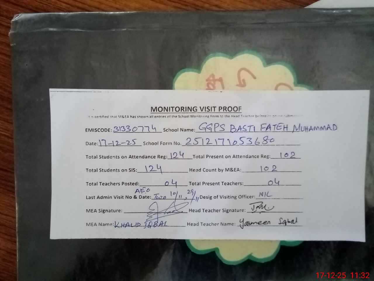 | EMIS Code: 31330774 | Name of School: GGPS BASTI FATEH MUHAMMAD | |||