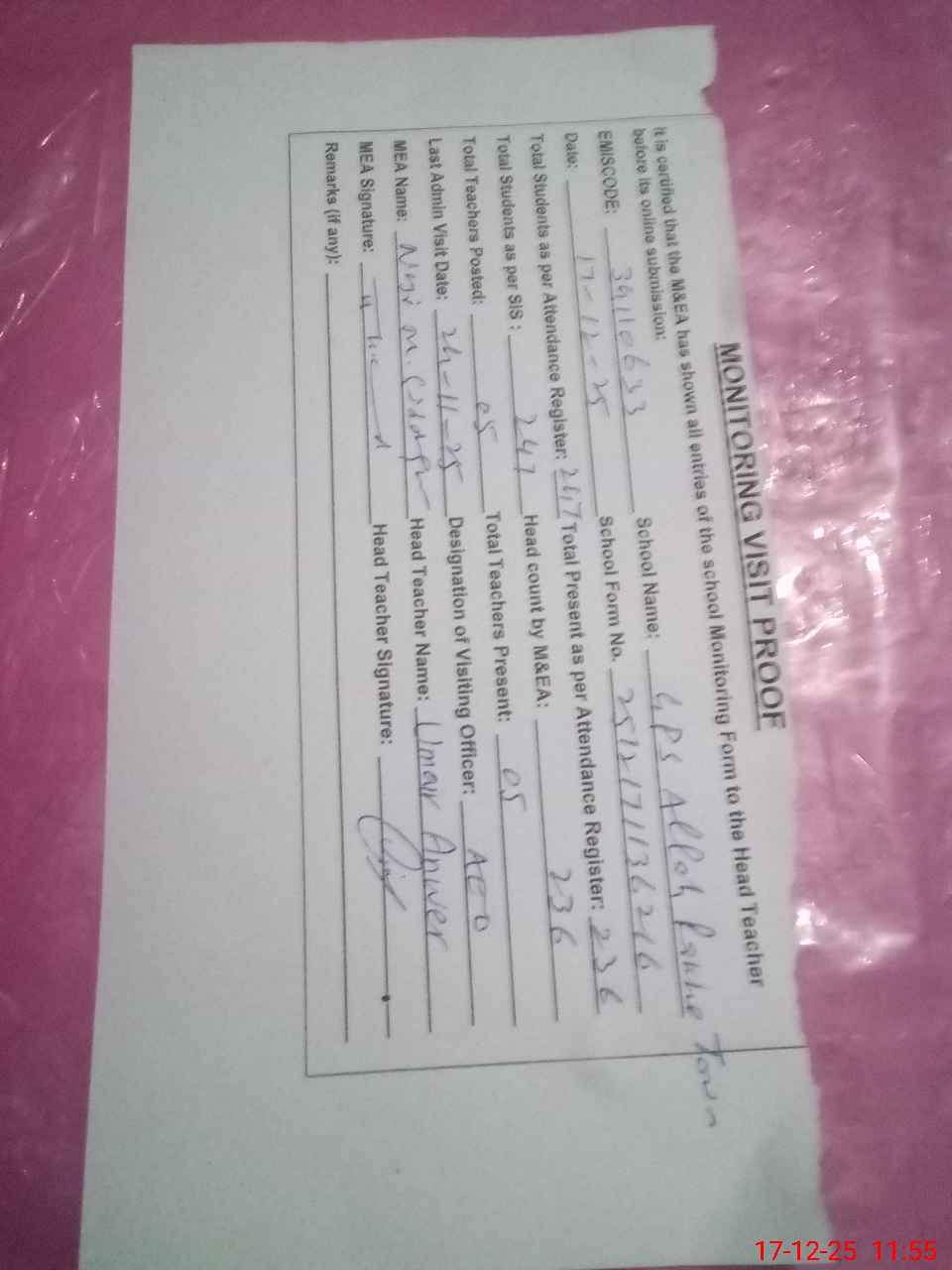 | Attendance Register | Head Teacher | MEA with School | Visit Proof |