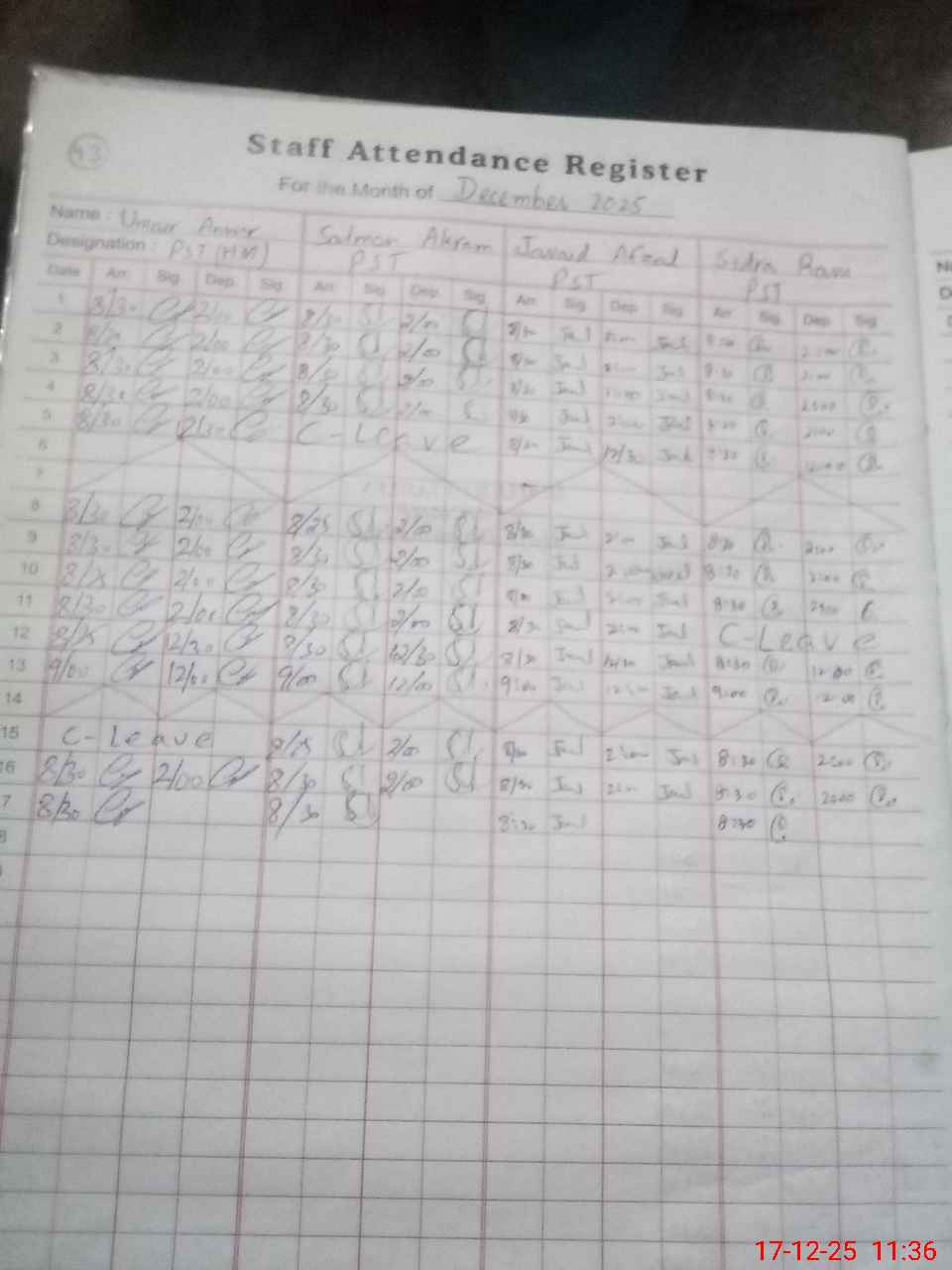 | CNIC | Full Name | Designation | R/C | Absence During Last Calender Month |