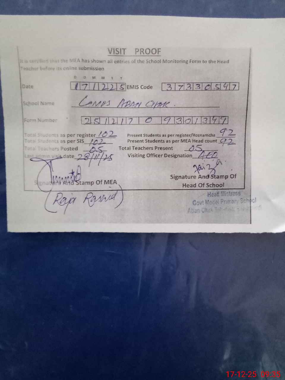 | Attendance Register | Head Teacher | MEA with School | Visit Proof |
