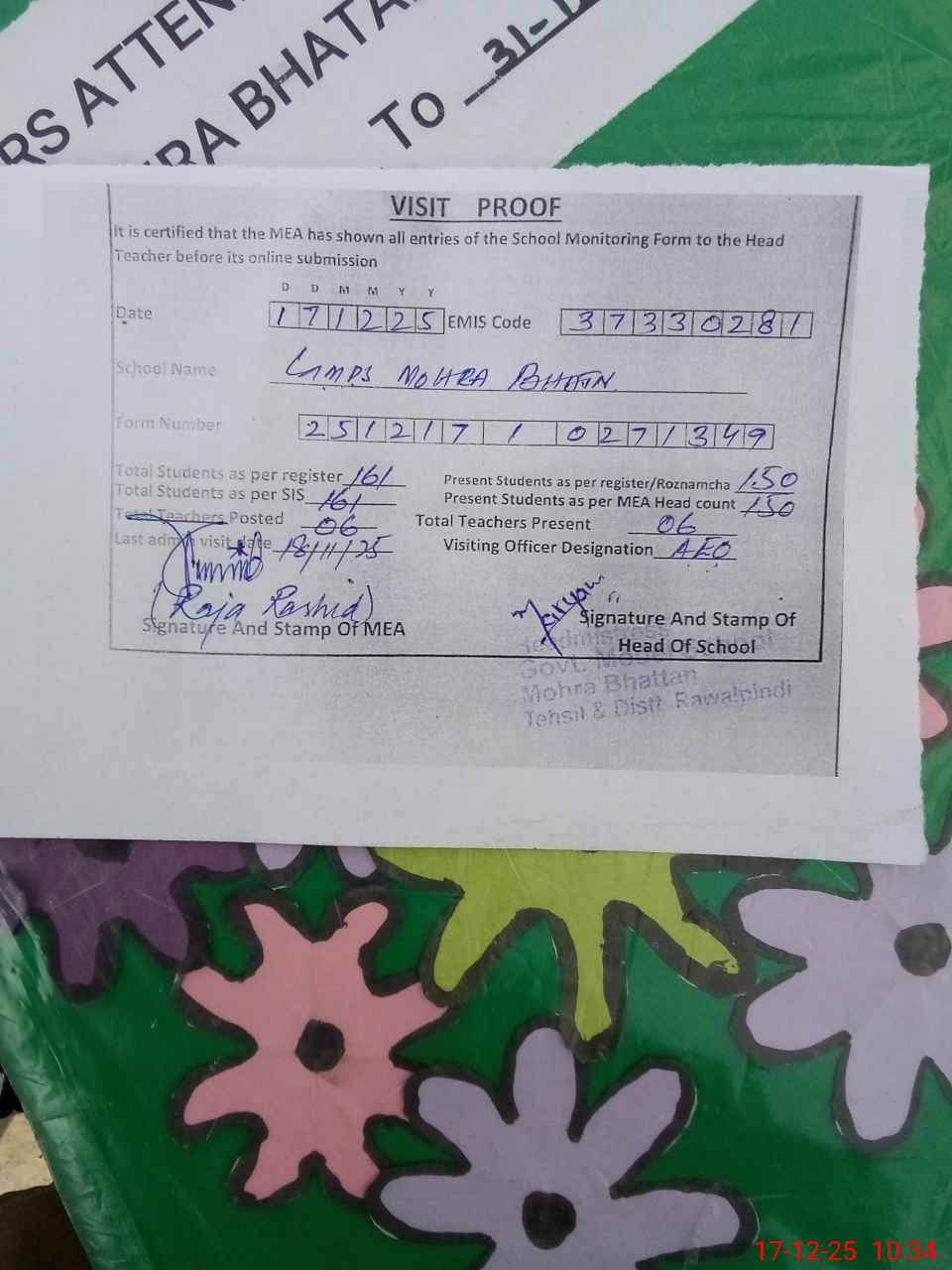 | Attendance Register | Head Teacher | MEA with School | Visit Proof |