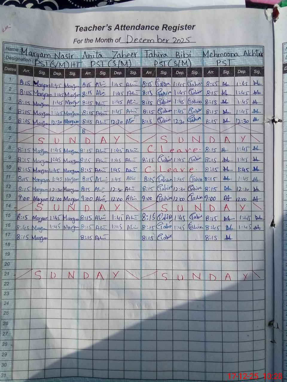 | CNIC | Full Name | Designation | R/C | Absence During Last Calender Month |