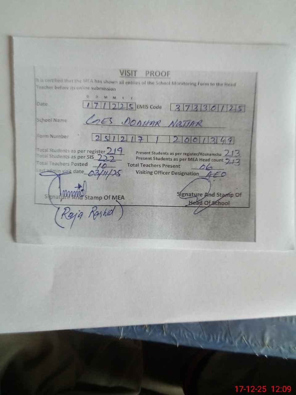| Certified that this School was Inspected by the Undersigned MEA/DMO Today and the Information Stated Above is as Per Record. | |||||