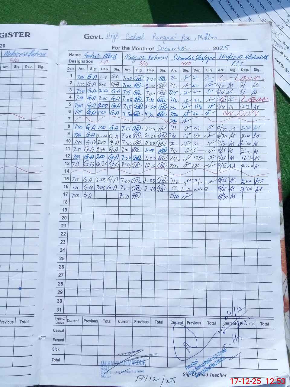 | CNIC | Full Name | Designation | R/C | Absence During Last Calender Month |