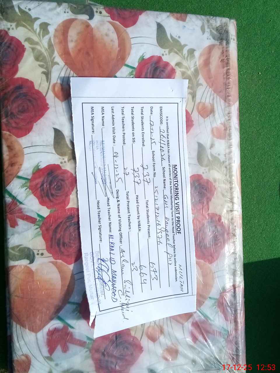 | EMIS Code: 36110026 | Name of School: GHS RANGEEL PUR SURAJ KUND ROAD MULTAN | |||