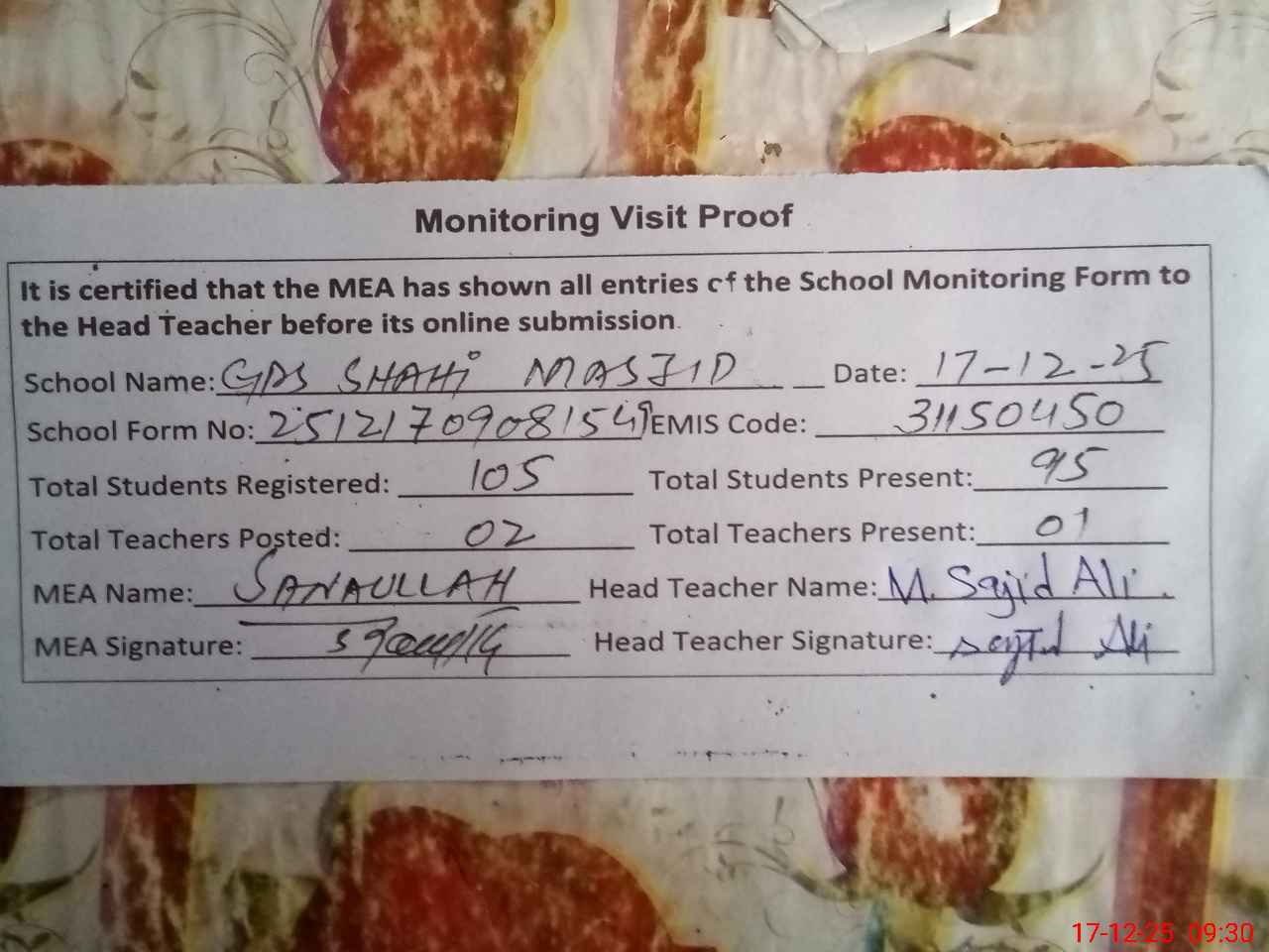| EMIS Code: 31150450 | Name of School: GPS MASJID SHAHI MASHID | |||