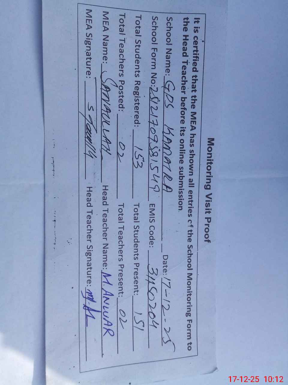 | Attendance Register | Head Teacher | MEA with School | Visit Proof |