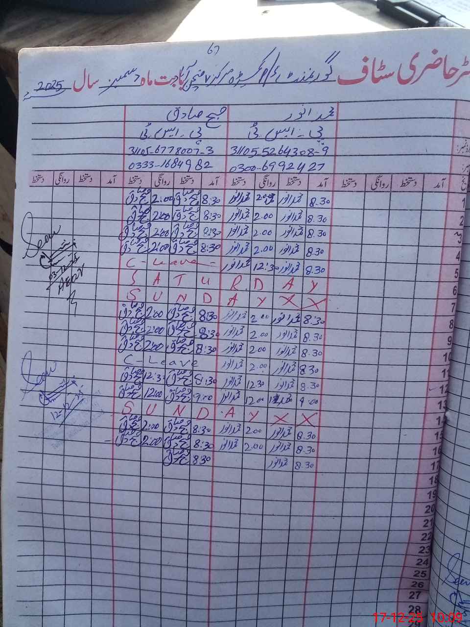 | CNIC | Full Name | Designation | R/C | Absence during last cal. month |