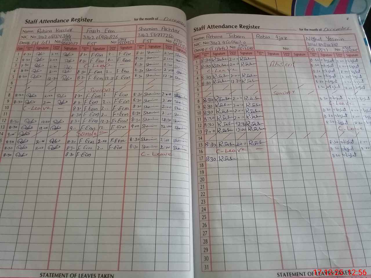 | CNIC | Full Name | Designation | R/C | Absence During Last Calender Month |