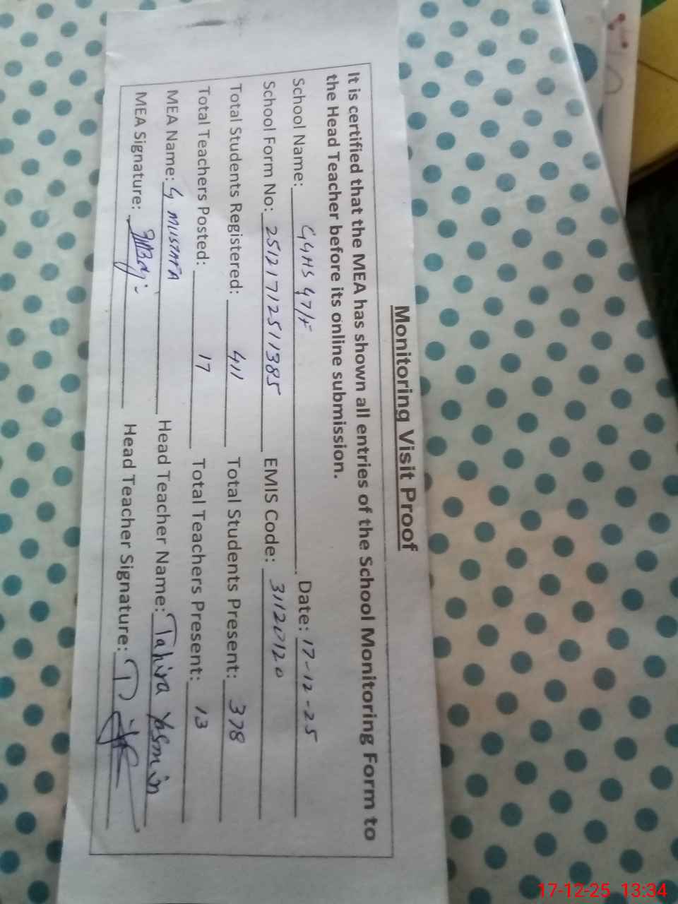 | Attendance Register | Head Teacher | MEA with School | Visit Proof |