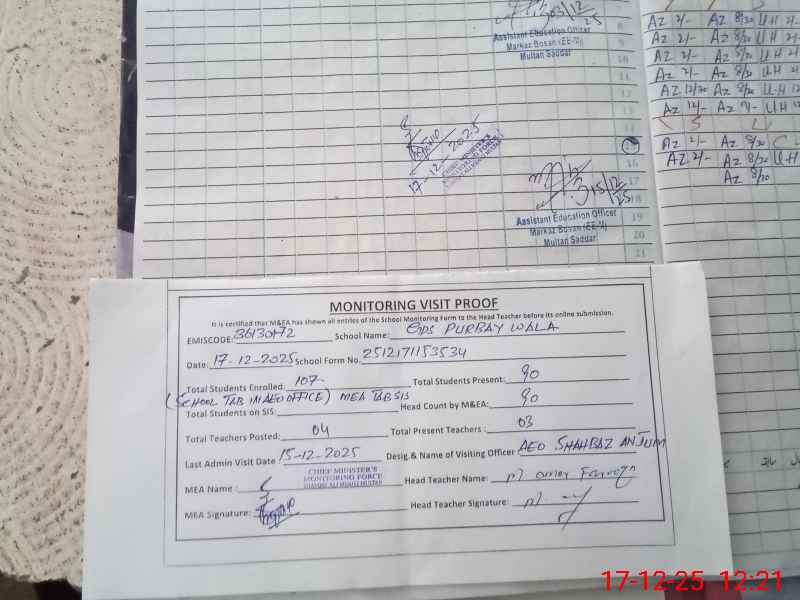 | EMIS Code: 36130172 | Name of School: GPS PURBAY WALA MARDAN PUR MULTAN | |||
