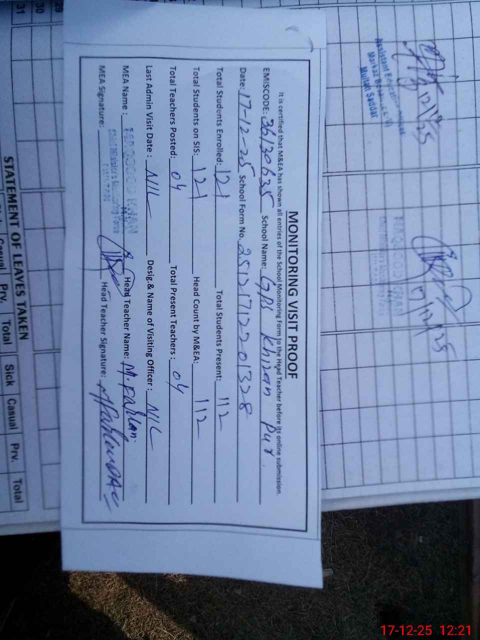 | EMIS Code: 36130635 | Name of School: GPS KHIZAN PUR MULTAN | |||