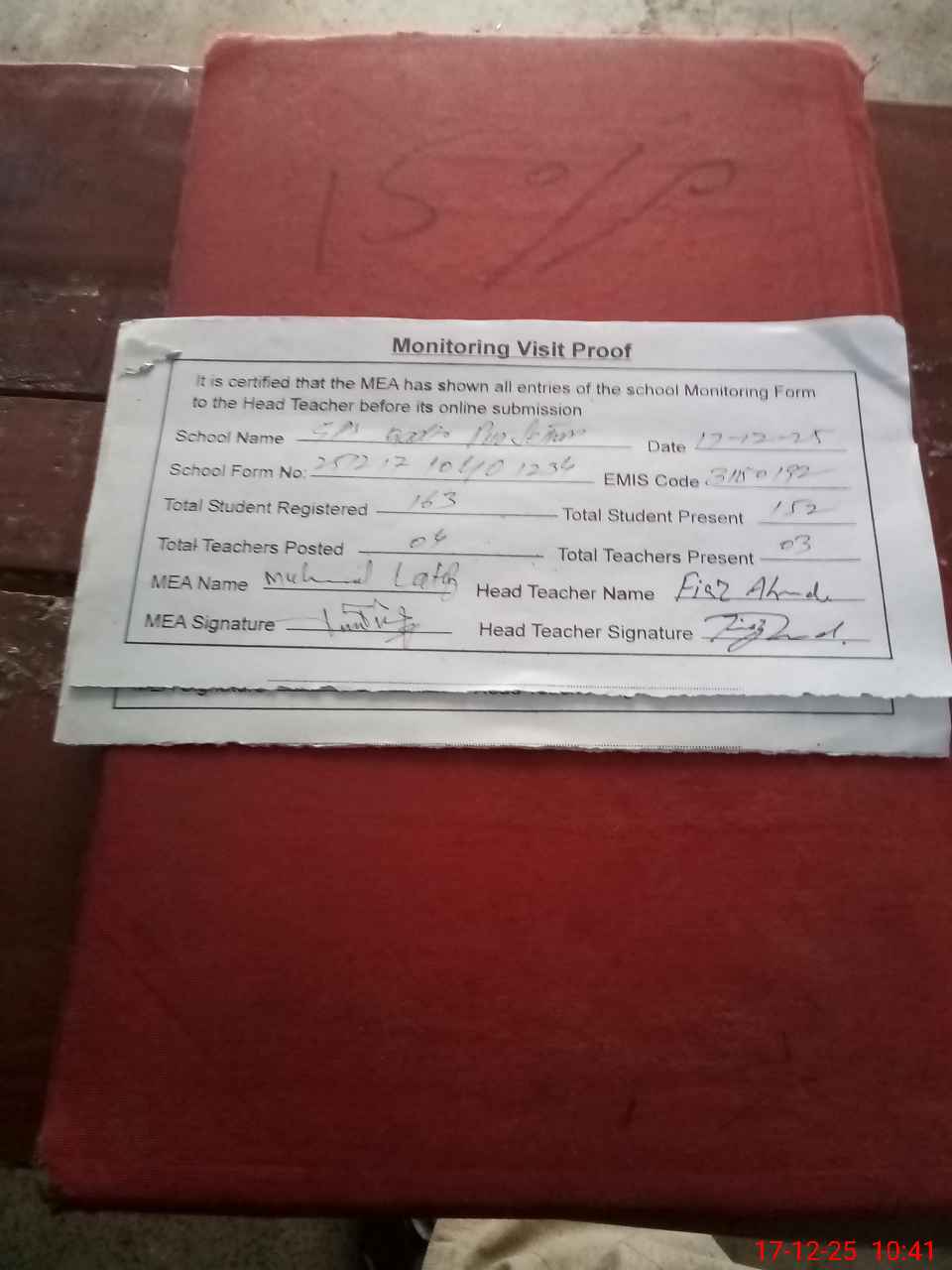 | Attendance Register | Head Teacher | MEA with School | Visit Proof |