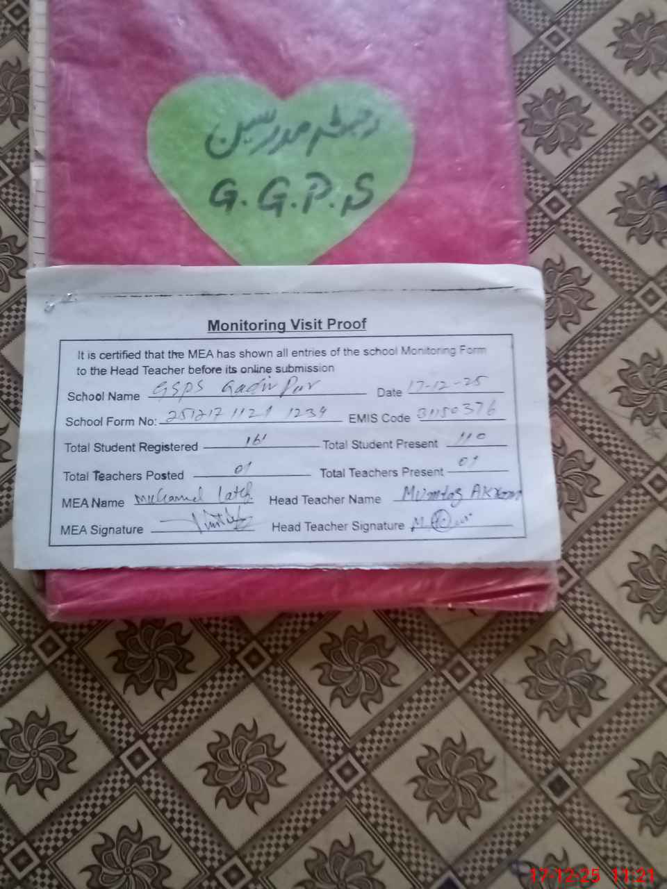 | Attendance Register | Head Teacher | MEA with School | Visit Proof |