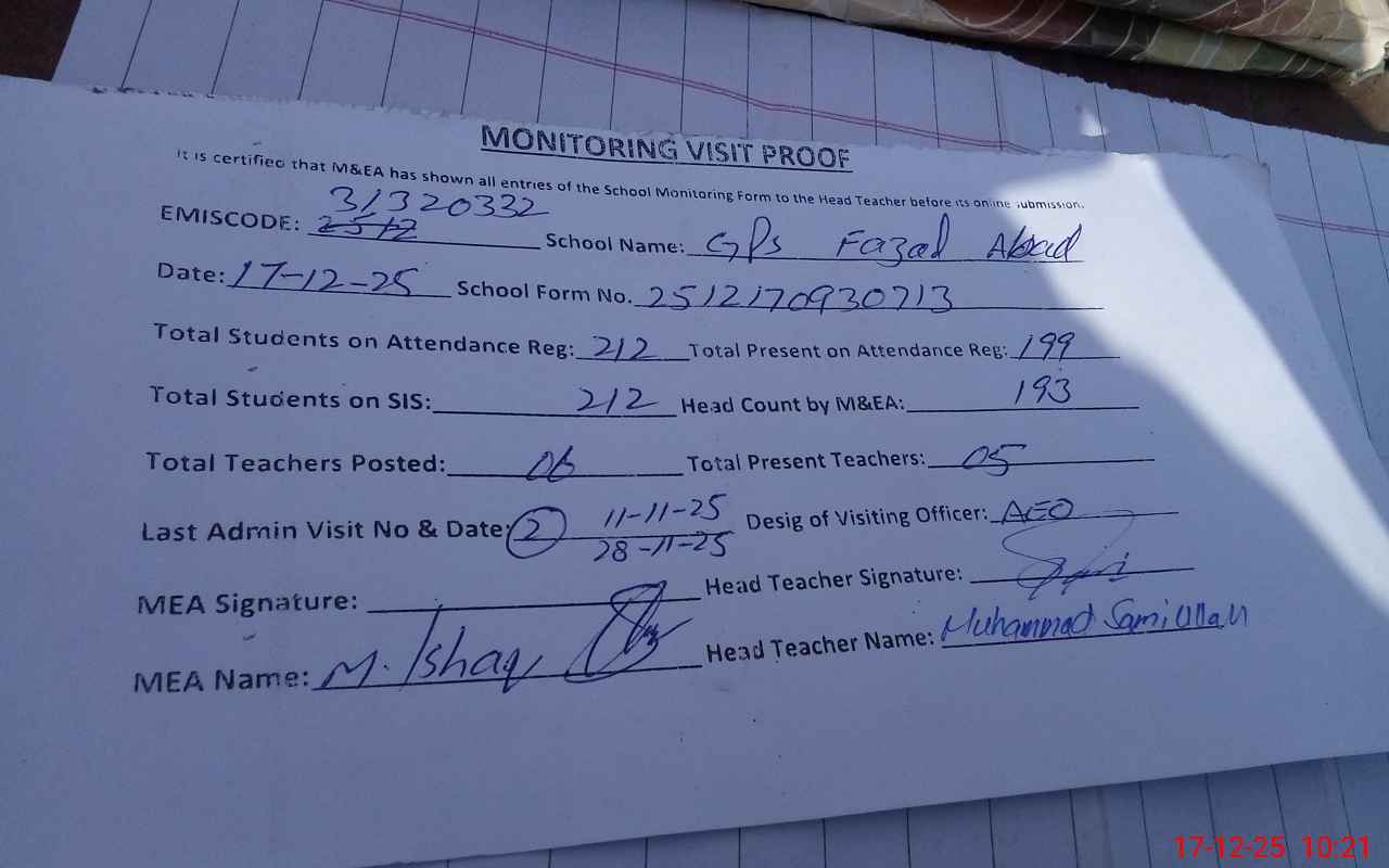 | EMIS Code: 31320332 | Name of School: GPS FAZAL ABAD | |||