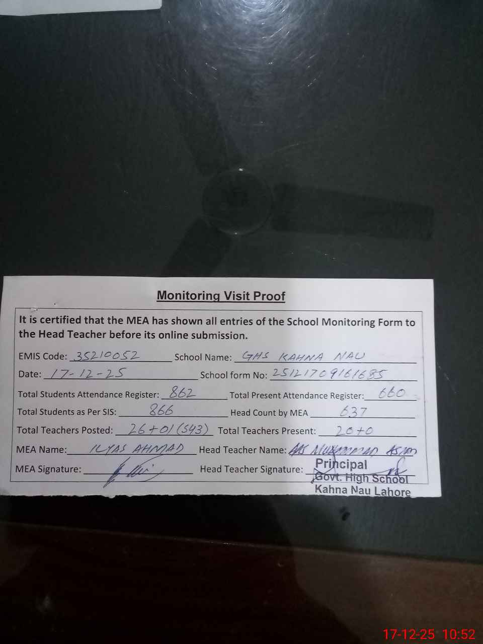 | EMIS Code: 35210052 | Name of School: GHS KAHNA NAU | |||