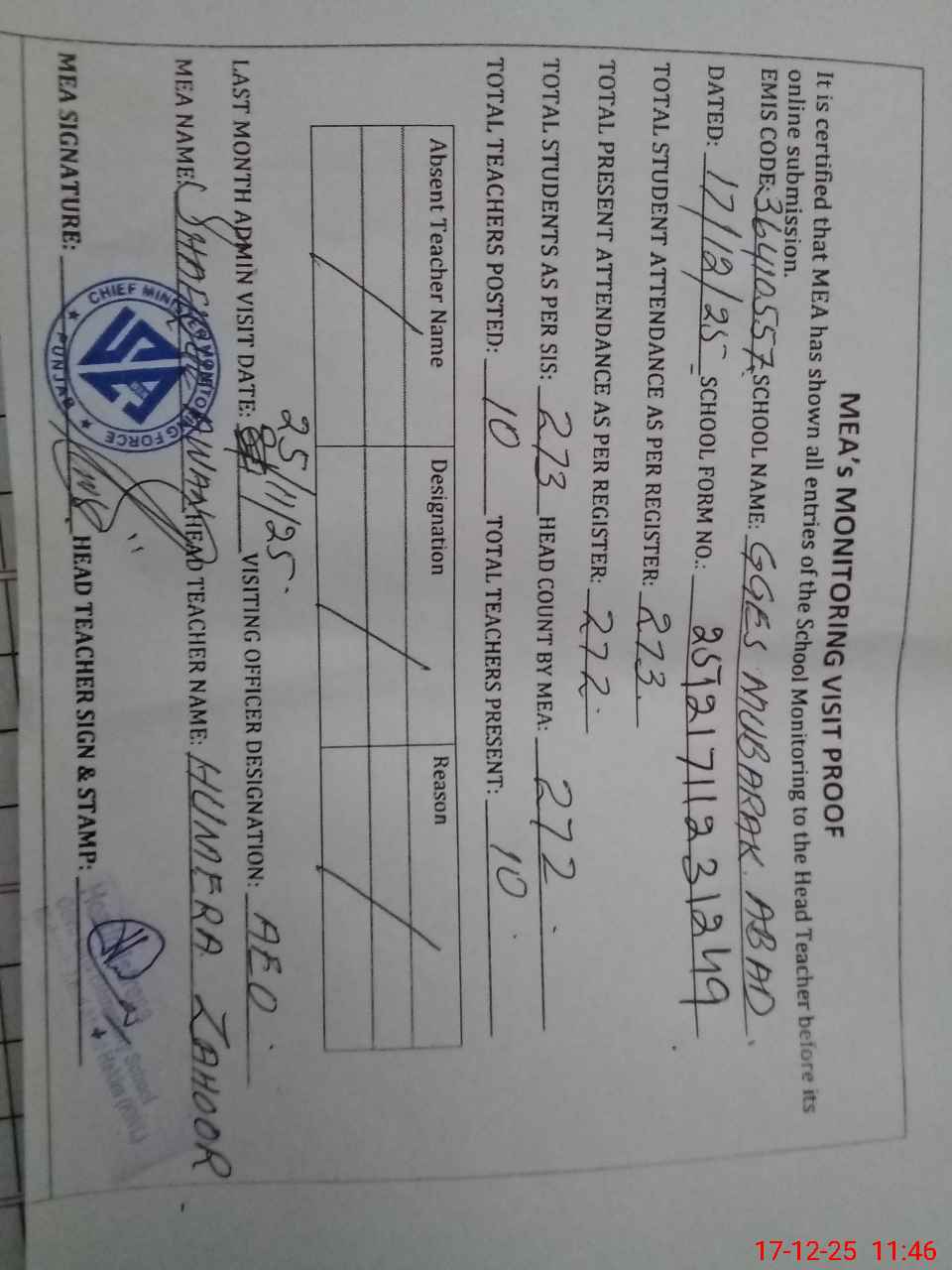 | Attendance Register | Head Teacher | MEA with School | Visit Proof |