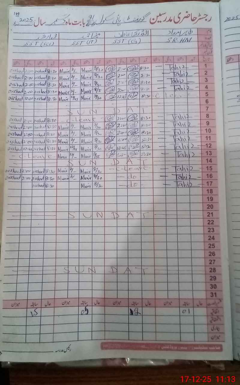 | CNIC | Full Name | Designation | R/C | Absence During Last Calender Month |