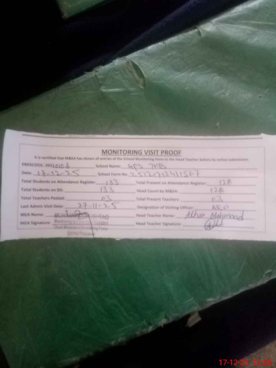 | Attendance Register | Head Teacher | MEA with School | Visit Proof |