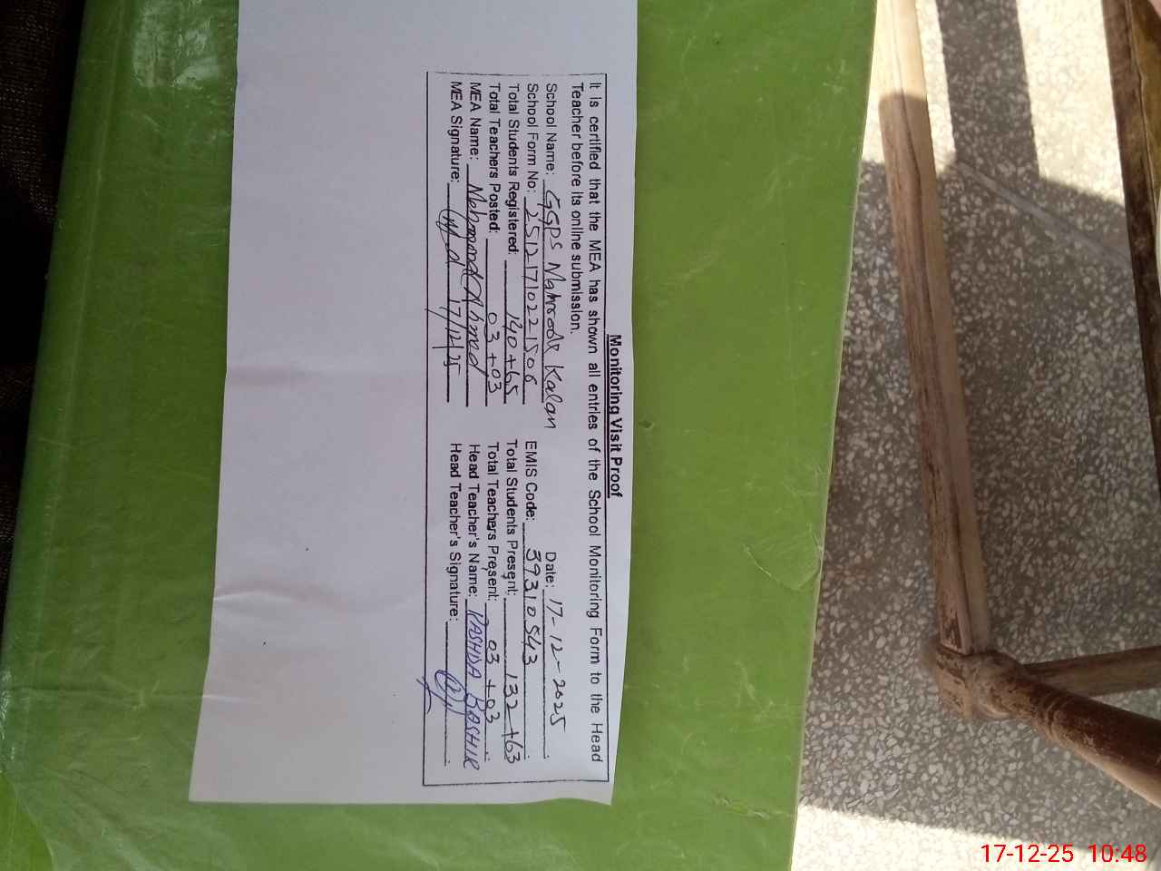 | Attendance Register | Head Teacher | MEA with School | Visit Proof |