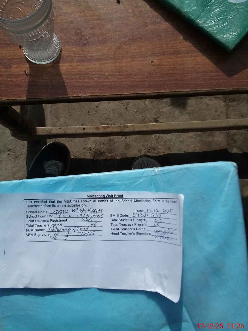 | Attendance Register | Head Teacher | MEA with School | Visit Proof |