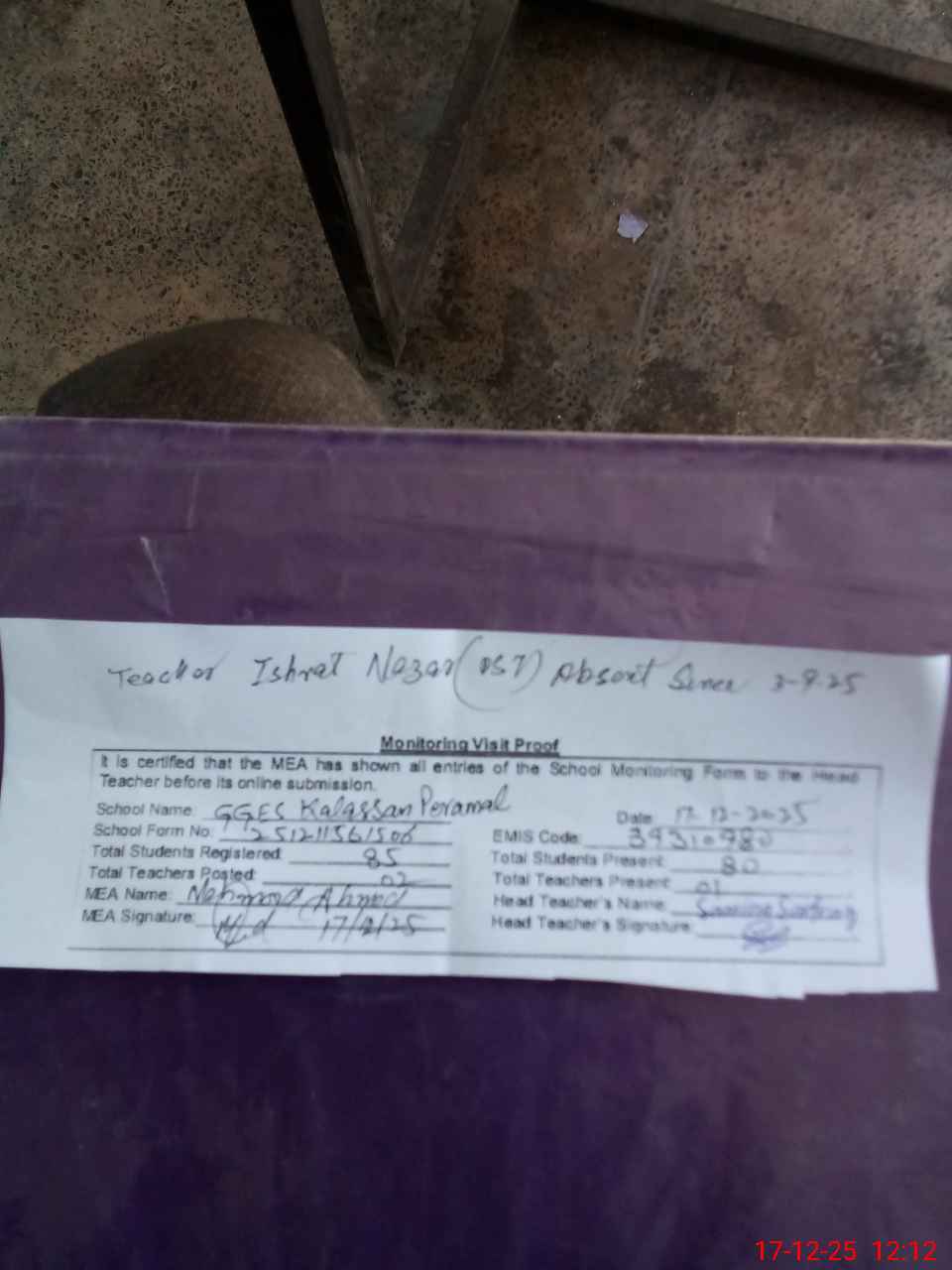 | Attendance Register | Head Teacher | MEA with School | Visit Proof |