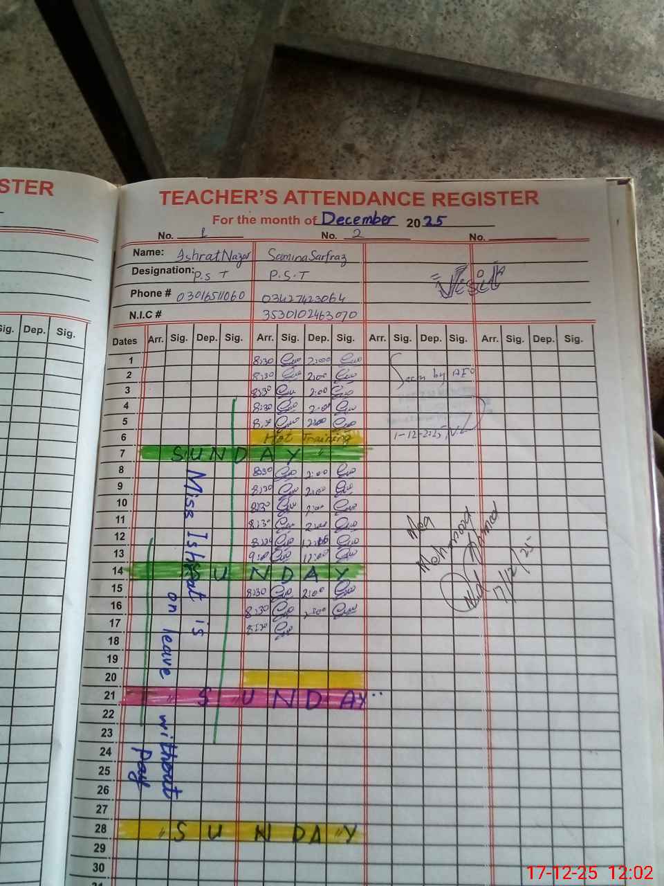 | CNIC | Full Name | Designation | R/C | Absence During Last Calender Month |