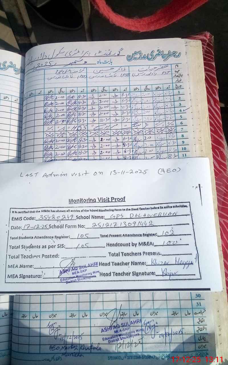 | Attendance Register | Head Teacher | MEA with School | Visit Proof |