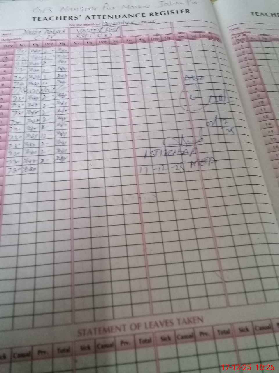 | CNIC | Full Name | Designation | R/C | Absence During Last Calender Month |