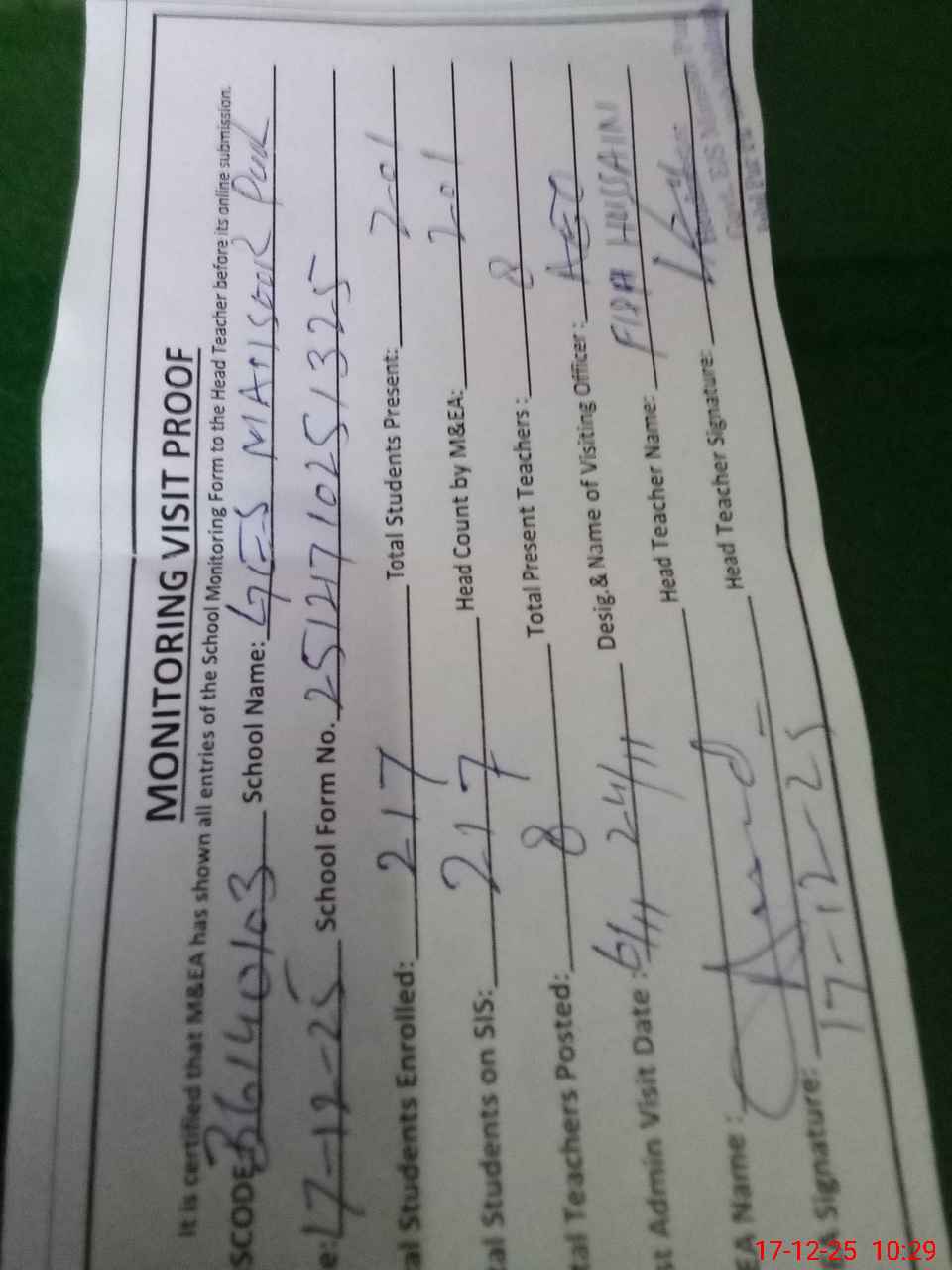 | Attendance Register | Head Teacher | MEA with School | Visit Proof |