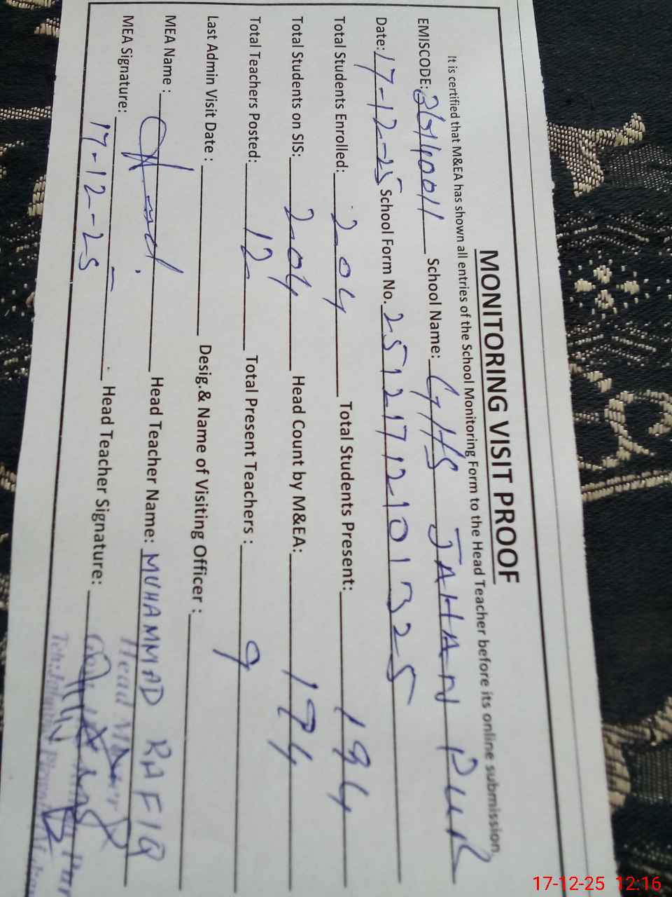 | Certified that this School was Inspected by the Undersigned MEA/DMO Today and the Information Stated Above is as Per Record. | |||||