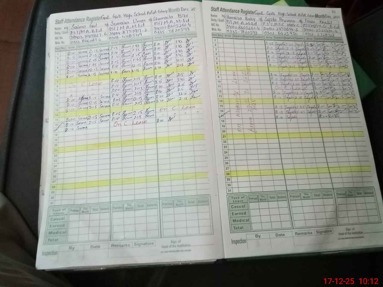 | CNIC | Full Name | Designation | R/C | Absence During Last Calender Month |